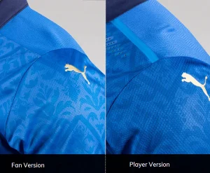 On the Fan version, most applications are embroidered or sewn-on, meaning they have a thread-like feel and are durable, able to withstand extensive wear and numerous wash cycles. On the Player version, applications are heat-pressed, meaning they have a smooth, synthetic feel and must be handled with care when washed.
